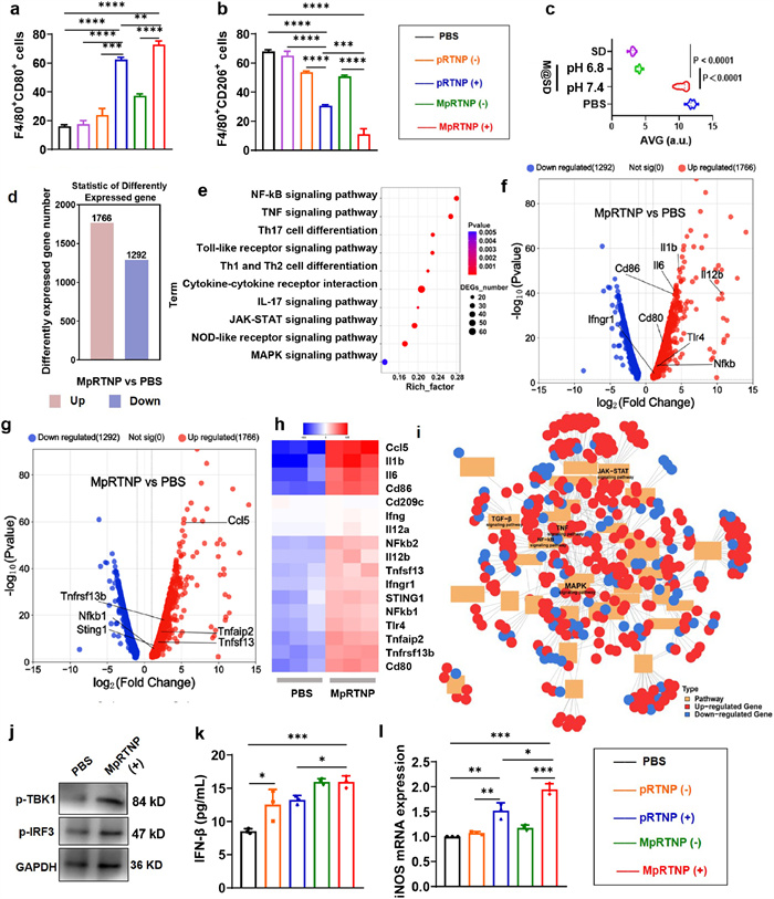 Figure 2  In vitro macrophage polarization, antifibrosis and transcriptome analysis. (a, b) Semi-quantitative analysis of F480+CD80+ (a) and F480+CD206+ (b) cell populations in RAW264.7 cells with different treatments. (c) Semi-quantitative analysis of α-SMA expression in NIH3T3 cells after different treatments. (d) Differentially expressed genes. (e) Upregulated top KEGG pathway analysis. (f, g) Macrophage polarization volcano plot. (h) Hierarchical cluster analysis for the gene expression of other inflammatory agents (gene ontology (GO) database). Genes were selected from the complete gene list with cut-off |log2FC| > 0.25. (i) KEGG grid diagram of organic systems. (j) Western blot analysis of markers p-TBK1 and p-IRF3 of RAW264.7 cells. Glyceraldehyde-3-phosphate dehydrogenase (GAPDH) served as a loading control. (k) Expression of IFN-β in RAW264.7 cells measured by ELISA. (l) Reverse transcription real-time quantitative polymerase chain reaction (RT-qPCR) analysis of iNOS expression in RAW264.7 cells under various treatments. Data are presented as mean ± SD (n = 3). (−): No laser, (+): With laser irradiation (660 nm, 100 mW/cm2, 3.5 min). Statistical significance was analyzed by one-way ANOVA with Tukey's multiple comparisons test. P < 0.05, **P < 0.01, ***P < 0.001, ****P < 0.0001.