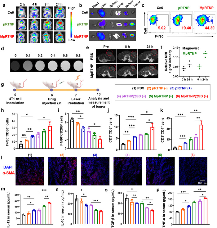 Figure 3  In vivo tumor accumulation and TME regulation. (a) In vivo tumor accumulation at different time points. (b) Ex vivo images at 24 h post-injection. (c) Detection of Ce6 fluorescence in macrophages using flow cytometry. (d) T1-MRI images of MpRTNP chelated with Gd3+ at different concentrations. (e, f) T1-weighted MRI images (e) of tumor-bearing mice before and after i.v. injection of Magnevist and MpRTNP chelated with Gd3+ in vivo, along with the semi-quantitative analysis (f). (g) Schematic representation and grouping of the in vivo biodistribution and TME remodeling experimental design for panels (h–p). (h, i) Semi-quantitative analysis of CD80+ (h) and CD206+ (i) cells in mice after different treatments. (j, k) Semi-quantitative analysis of CD3+CD8+ (j) and CD3+CD4+ (k) T cells in tumor tissue after different treatments, as measured by flow cytometry. (l) α-SMA staining for characterizing CAFs in tumor tissue following various treatments. Cell nuclei were stained with 4′, 6-diamidino-2-phenylindole (DAPI). (m–p) Detection of cytokines IL-12 (m), IL-10 (n), TGF-β (o), and TNF-α (p) in serum via ELISA after treatments. Data are presented as mean ± SD (n = 3). P < 0.05, **P < 0.01, ***P < 0.001 by one-way ANOVA with Tukey's post hoc test. ns, no significance.