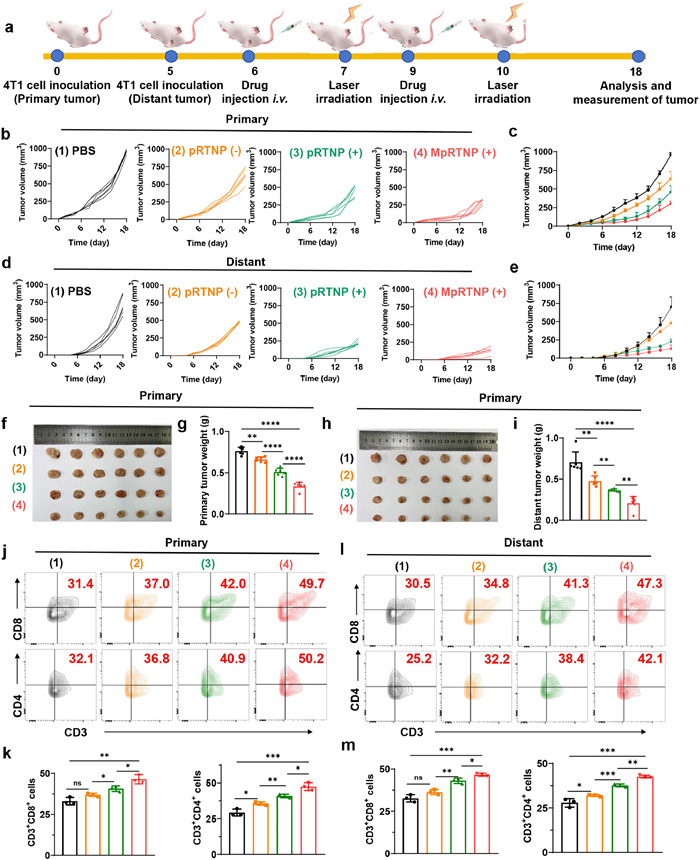 Figure 4.  In vivo distant efficiency of MpRTNP nanoparticles. (a) Schematic illustration of primary and distant tumor inoculation, drug administration, tumor volume monitoring, and analysis. Individual (b) and average (c) primary tumor volume growth curves following different treatments (n = 6 per group). Individual (d) and average (e) distal tumor volume growth curves. Images of primary tumors (f) and tumor weights (g) in mice on day 18. Distal tumor images (h) and tumor weight (i) for mice on day 18. Representative percentages (j) and semi-quantitative analysis (k) of CD3+CD8+ in primary tumor tissue, as measured by flow cytometry. Representative percentages (l) and semi-quantitative analysis (m) of CD3+CD4+ T cells in distal tumor tissues after different treatments. Data are presented as mean ± SD. P < 0.05, **P < 0.01, ***P < 0.001, ****P < 0.0001 by one-way ANOVA with Tukey's post hoc test.