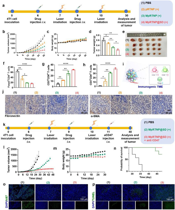 Figure 5  In vivo antitumor efficacy and survival experiment with MpRTNP@SD nanoparticles. (a) Schematic illustration of tumor inoculation, drug administration, tumor volume monitoring, and analysis. (b) Average tumor volume growth curves after treatment (n = 5 per group). (c) Body weight changes over the treatment period. (d) Tumor weights at the therapeutic endpoint. (e) Images of tumors from mice on day 30. (f–h) Semi-quantitative analysis of CD4+Foxp3+ (f), CD8+CD3+ (g), and CD4+CD3+ (h) percentages in tumor tissues following treatment, as measured by flow cytometry. (i) Schematic illustration of the immunogenic TME. (j) Immunohistochemical staining of α-SMA and fibronectin in 4T1 tumors. (k) Schematic illustration of tumor inoculation, drug administration, tumor volume monitoring, and analysis (n = 8 per group). (l) Average tumor volume growth curves. (m) Body weight changes. (n) Survival curves showing the impact of different treatments. (o, p) Tumor tissue analysis using Ki67 (o) and TUNEL (p) staining. Data are presented as mean ± SD. P < 0.05, **P < 0.01, ***P < 0.001, ****P < 0.0001 by one-way ANOVA with Tukey's post hoc test.