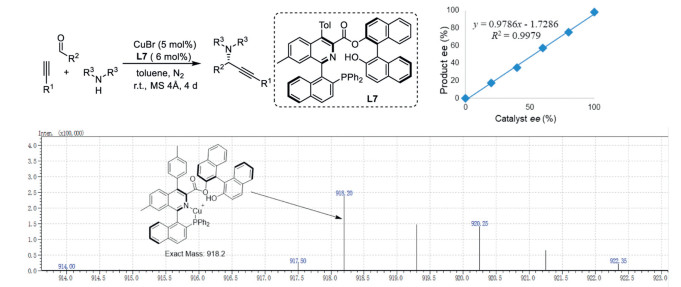 Then, we tried the enantioselective A3-coupling for the synthesis of chiral propynyl amines (Table 2). First, ligands 7, 8, 11 and 12 were screened by the reaction of cyclohexanecarbaldehyde, dibenzylamine and ethynyltrimethylsilane, ligand 7 give the better results, regarding the yield and ee value (Table 2, entries 1 vs. 2–4). It should be mentioned the ee value by ligand 7 is higher than that by Quinap (Table 2, entry 1) [44]. Therefore, the most challenging linear aliphatic (Table 2, entries 6 and 7) and aromatic aldehydes (Table 2, entries 8–22) in A3 reaction were screened by using ligand 7. As shown in Table 2, the reactions were generally highly enantioselective over a range of aldehydes. Remarkably, electron-rich or -poor aromatic aldehydes, naphthaldehyde, heteroaryl aldehydes and ferrocenecarboxaldehyde have little effect on enantioselectivity, whereby the ee values much higher than those obtained by Quinap (entries 8–13, 15–18, 21 and 22) [45,46]. Furthermore, 2-methyl and 2-bromobenzaldehydes gave 95% and 80% ee (Table 2, entries 19 and 20), whereas Quinap affording 32% and 25% ee, respectively [46]. In the enantioselective A3-coupling, Quinap demonstrated a strong positive nonlinear effect [45], while a perfect linear effect was displayed between the enantiopurity of ligand L7 and product (Fig. 1). This result indicated that a monomeric copper(Ⅰ) complex with a single chiral ligand is most likely involved as the catalytically active species, which signal with m/z of 918.20 by ESI mass spectrometric experiment matched the m/z of mono-ligated species [Cu(L7)]+ (Fig. 1, calcd. for C60H42CuNO3P+: 918.2). It is very possible that the bulky BINOL ester group on 3-position of L7 causes the distinct coordination mode of copper with ligand L7 or Quinap and renders the chiral amine products in higher enantioselectivity. A plausible mechanism of this A3 coupling was proposed in Fig. S3 (Supporting information).