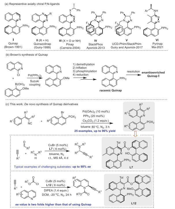 In summary, we have developed an efficient and straightforward strategy for the expeditious synthesis of a wide range of isoquinoline ring-modified Quinapos through a palladium-catalyzed imidoylative cyclization of arylethenyl isocyanides and 2-diphenylphosphinyl-1-naphthyl bromides. This reaction tolerates many functional groups, is easy scale-up and renders Quinap derivatives with substitution patterns not obtained using coupling reactions. A new class of chiral biaryl P, N-ligand combining Quinap and BINOL is readily available and has been illustrated to be superb chiral ligands for the copper-catalyzed enantioselective A3-coupling reaction as well as asymmetric quinoline alkynylation. Compared to the wee-known unsubstituted Quinap ligand, the remarkable features of this work are: (a) The readily accessible a wide range of isoquinoine ring-modified Quinapos could permit fine tuning of the steric and electronic effects, which is possible to make Quinap derivatives good performance in a broad scope of catalytic asymmetric reactions; (b) The combination with CuBr forms an efficient catalytic system that has been applied to various challenging substrates with more higher enantioselectivity than those using Quinap; (c) It is most likely that monomeric copper(Ⅰ) complex with a single chiral ligand L7 was formed and served as the catalytically active species. Further studies aimed at their application are underway in our laboratories.