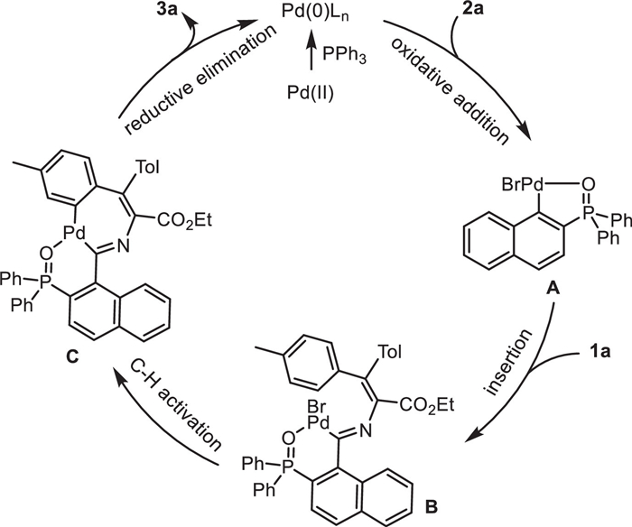 On the basis of the present results and literature precedent [2731], a plausible mechanistic pathway is proposed in Scheme 3 (exemplified by the reaction of 1a with 2a). First, oxidative addition of aryl bromide 2a with Pd(0) and coordination with the diphenylphosphine oxide group [44] produce a five-membered Pd(Ⅱ) intermediate A. Next, coordination and migratory insertion of isocyano group in 1a into C-Pd bond of A affords imidoyl palladium B. Then, activation of the C(sp2)-H bond of intermediate B gives a seven-membered palladacycle C [28]. Finally, reductive elimination delivers Quinapo 3a while concomitantly releasing the catalyst Pd(0) for the next catalytic cycle.