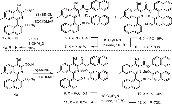 With these racemic Quinapos in hand, we arbitrarily selected 3a as the potential ligand. The resolution of 3a was achieved by transformation to the diastereomeric esters with (S)-BINOL or mono-methylated (S)-MeBINOL, which were easily separated at this stage via column chromatography on silica gel (Scheme 4), affording the Quinapo derivatives 5, 6, 9 and 10. Subsequently, Quinap esters 7, 8, 11 and 12 were obtained in moderate to high yields from Quinapo derivatives 5, 6, 9, and 10 by the reduction with HSiCl3. The absolute configurations of ligands 7 and 12 were shown to be (S) and (R) by X-ray single-crystal analysis (CCDC: 2367490 and CCDC: 2367487), respectively.