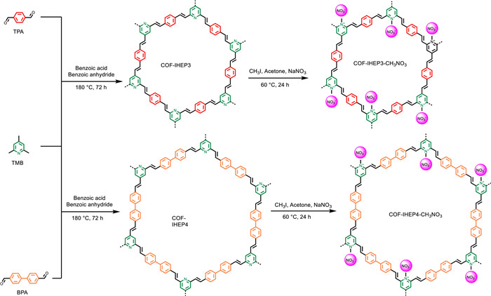 Figure 1.  Design and synthesis. Syntheses of COF-IHEP3 by condensation of TMB and TPA, and synthesis of COF-IHEP4 by reaction of TMB and BPA. Synthesis of ionic COF-IHEP3-CH3NO3 and COF-IHEP4-CH3NO3 through post-modified strategy.
