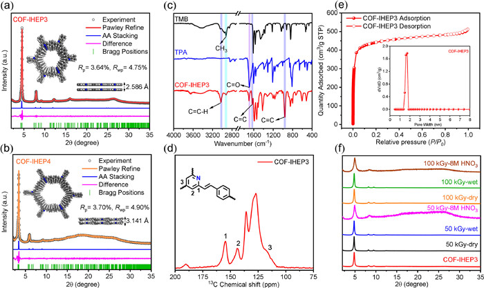 Figure 2  (a) PXRD patterns of COF-IHEP3. (b) PXRD patterns of COF-IHEP4. Pawley refinement (orange line), experimental data (black cross), computational simulation (blue line), refinement-experiment difference (pink line) and the Bragg positions (green short sticks). (c) FT-IR spectra of COF-IHEP3, and corresponding monomers. (d) Solid-state 13C NMR spectra of COF-IHEP3. (e) N2 adsorption-desorption isotherms of COF-IHEP3 at 77 K. (f) PXRD patterns of COF-IHEP3 by exposing the COFs to 50 kGy and 100 kGy doses of γ rays in dry, pure water and 8 mol/L HNO3 environments, respectively.