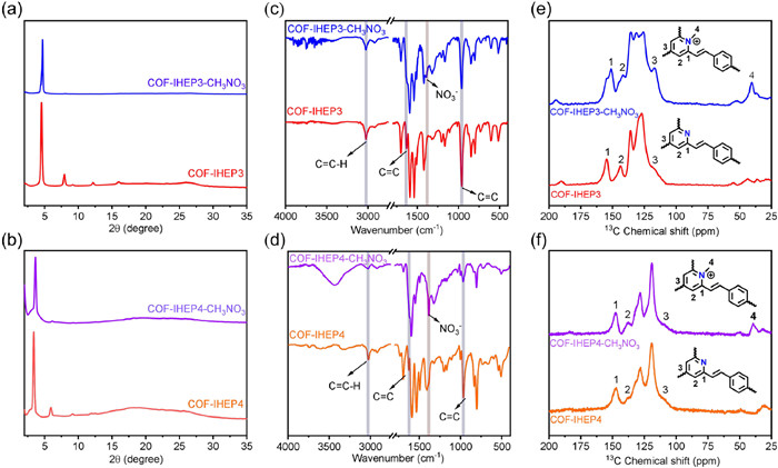 Figure 3.  (a) PXRD patterns of COF-IHEP3 and COF-IHEP3-CH3NO3. (b) PXRD patterns of COF-IHEP4 and COF-IHEP4-CH3NO3. (c) FT-IR spectra of COF-IHEP3 and COF-IHEP3-CH3NO3. (d) FT-IR spectra of COF-IHEP4 and COF-IHEP4-CH3NO3. (e) Solid-state 13C NMR spectra of COF-IHEP3 and COF-IHEP3-CH3NO3. (f) Solid-state 13C NMR spectra of COF-IHEP4 and COF-IHEP4-CH3NO3.