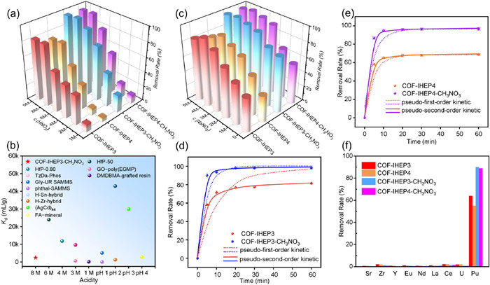 Figure 4  (a) Effect of HNO3 at different concentrations on removal rate of Pu(Ⅳ). (330 Bq/mL, m/v = 20 mg/mL). (b) The performance comparison diagram of the material. (c) Effect of NO3- at different concentrations on removal rate of Pu(Ⅳ). (d) Adsorption kinetic of Pu(Ⅳ) by COF-IHEP3 and COF-IHEP3-CH3NO3. (e) Adsorption kinetic of Pu(Ⅳ) by COF-IHEP4 and COF-IHEP4-CH3NO3. (f) Adsorption of Pu(Ⅳ) under the conditions of spent fuel associated metal ions.