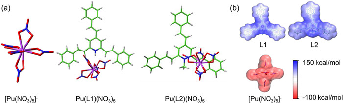 Figure 5.  (a) The geometric structures of [Pu(NO3)5]-, Pu(L1)(NO3)5, and Pu(L2)(NO3)5 (L1 = L-H; L2 = L-CH3) compounds optimized at the B3LYP/6–31G(d,p)/RECP theoretical level. (b) ESP plots of (L1)+, (L2)+ ligands and [Pu(NO3)5]- anions.