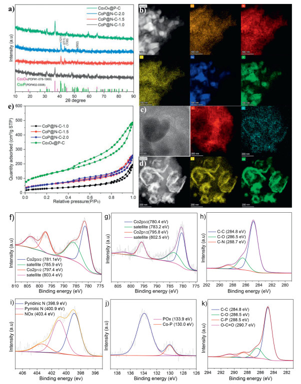 Figure 2.  (a) XRD of CoP@N—C-1.0, CoP@N—C-1.5, CoP@N—C-2.0 and Co3O4@P-C. (b) Elemental mapping image of CoP@N—C-1.5. (c) TEM image of Co3O4@P-C. (d) Elemental mapping image of Co3O4@P-C. (e) Nitrogen adsorption isotherm of CoP@N—C-1.0, CoP@N—C-1.5, CoP@N—C-2.0 and Co3O4@P-C. (f) Co 2p XPS spectrum of CoP@N—C-1.5. (g) Co 2p XPS spectrum of Co3O4@P-C. (h) C 1s XPS spectrum of CoP@N—C-1.5. (i) N 1s XPS spectrum of CoP@N—C-1.5. (j) P 2p XPS spectrum of CoP@N—C-1.5. (k) C 1s XPS spectrum of Co3O4@P-C.