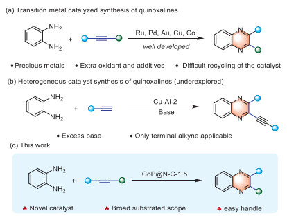 Currently, numerous synthesis methods have been developed [1115]. The annulation of alkynes with 1,2-diaminobenzenes to produce quinoxalines is considered the most economical due to its cost-effectiveness and the readily available raw materials. Among these, homogeneous catalysts based on Ru, Pd, Au, Cu, and Co have garnered significant attention for their role in the synthesis of quinoxaline (Scheme 1a) [1620]. Iodine or bromine-mediated methods for the preparation of quinoxalines have also been reported [2123]. However, these methods often require harsh conditions, including the use of precious metal catalysts, equivalent additives, extra oxidants, and the catalyst cannot easy to recycle. These conditions result in poor functional group tolerance, low atomic efficiency and catalytic efficiency, and high production costs, thereby limiting their industrial scalability. In response to growing demands for green chemistry and sustainable development, there has been increasing interest in environmentally friendly and cost-effective non-precious metal catalysts [24,25].
