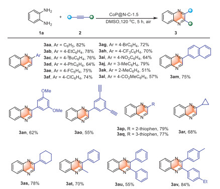 Having established the optimized condition, the generality of annulation of alkynes and 1,2-diaminobenzene with differently substituted aryl-substituted terminal was investigated (Scheme 2). The introduction of electron-donating groups allowed the reaction to proceed smoothly, producing the corresponding quinoxaline derivatives with 64%−82% yields (3aa-3ad). The introduction of electron-withdrawing groups to aryl-substituted alkynes led to the formation of quinoxaline derivatives, which yielded of 64%−75% (3ae-3ai). Notably, substrates with electron-withdrawing groups exhibited slightly lower yields, which may be attributed to a reduction in electron density of the carbon-carbon triple bonds, thereby hindering alkyne activation [56]. The yield of quinoxaline derivatives was slightly higher for 3-ethynyl-toluene (3aj) compared to 2-ethynyl-toluene (3ak), likely due to the steric hindrance. In the presence of an ester group and naphthalene, the corresponding quinoxaline can be obtained (3al, 3am). When two substituents were attached to the aryl-substituted alkyne, the corresponding products were also achieved (3an, 3ao). Additionally, when the terminal alkynes substituted by thiophene, cycloalkyl and cyclohexene, products of moderate yield can be obtained (3ap-3as). When two substituents were attached to the alkyne, the yields were 55%−84% (3at-3av). Realizing the cyclization reaction of endyne using traditional catalysts is challenging.