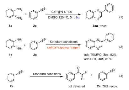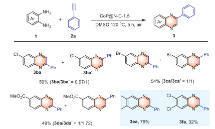 In summary, we have designed and synthesized a novel nano-catalyst (CoP@N—C-1.5), and used it to catalyze the annulation reaction of alkynes and 1,2-diaminobenzenes. The reaction showed a broad substrate scope and good functional group tolerance allowing the synthesis of a wide range of quinoxalines in good to high yields and the catalyst can be recycled up to three times. The active site of this catalyst consists of Co2P nanoparticles stabilized by nitrogen, as confirmed through structural characterization and experimental analysis. Detailed investigation into the reaction mechanism is currently underway in our laboratory.