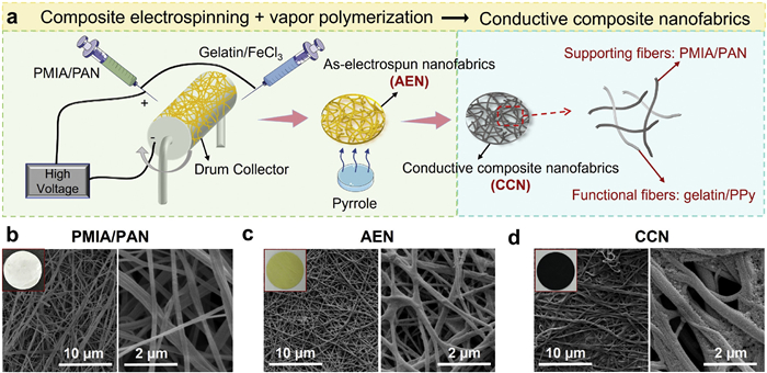 Figure 1.  (a) Fabrication process of the conductive composite nanofabrics (CCN). SEM images and the corresponding digital photos of the prepared (b) PMIA/PAN nanofabrics, (c) as-electrospun nanofabrics (AEN) and (d) CCN samples.