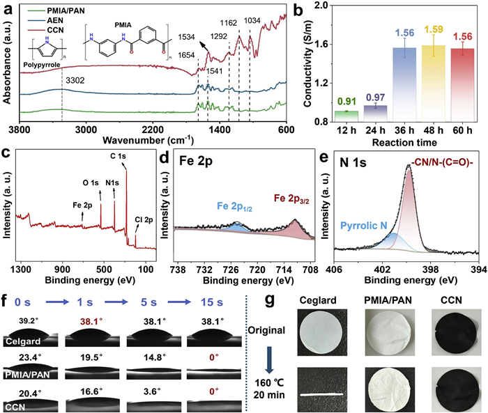 Figure 2  (a) Fourier-transform infrared (FT-IR) spectra of PMIA/PAN, AEN and CCN samples. (b) Electrical conductivity of the CCN as a function of vapor polymerization time. (c) Survey XPS spectra, high-resolution (d) Fe 2p and (e) N 1s spectra of CCN. (f) Comparison of contact angles between liquid electrolyte and the CCN, PMIA/PAN and Celgard separator. (g) Comparison of thermal dimensional stability of the CCN and Celgard separator.