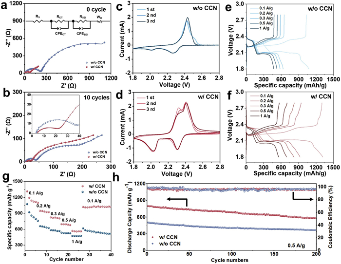 Figure 3.  The fitting Nyquist plots of the LSBs with or without CCN interlayer: (a) At fresh state and (b) after 10 cycles. Cyclic voltammetry (CV) curves of LSBs (c) without CCN and (d) with CCN interlayer. Galvanostatic charge/discharge profiles of LSBs (e) without CCN and (f) with CCN interlayer at different current densities. (g) Rate performance and (h) cyclic stability of LSBs with CCN and without CCN interlayer at 0.5 A/g.