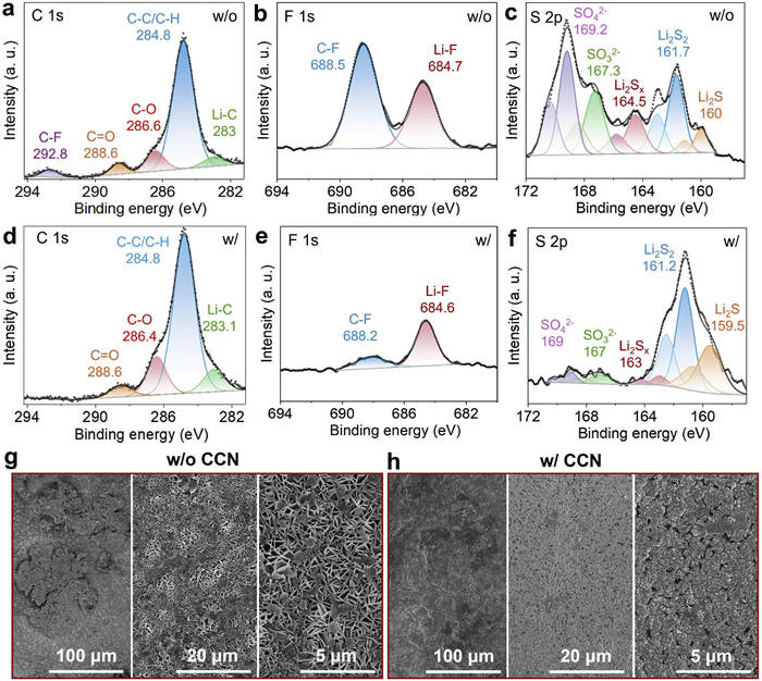 Figure 4  High-resolution (a) C 1s, (b) F 1s, and (c) S 2p spectra of the SEI layer on the surface of lithium metal anode in LSBs without CCN interlayer. High-resolution (d) C 1s, (e) F 1s, and (f) S 2p spectra of the SEI layer on the surface of lithium metal anode in LSBs with CCN interlayer. SEM images of lithium metal anode removed from the corresponding LSBs (g) without CNN and (h) with CCN interlayer.