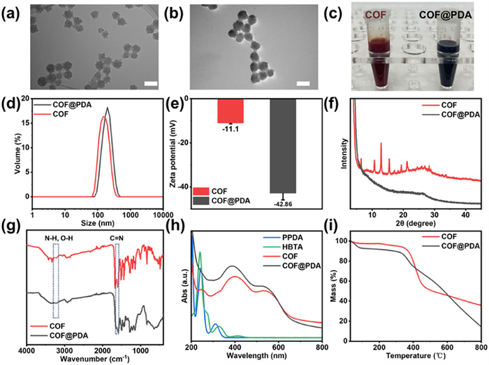 Figure 1  The physicochemical characterization of as-prepared COF and COF@PDA. TEM images of (a) COF and (b) COF@PDA. (c) The photograph of COF (left) and COF@PDA (right) solutions. (d) DLS curves, (e) zeta potential, (f) XRD patterns, and (g) FT-IR spectra of COF and COF@PDA. (h) UV–vis spectra of monomers, COF and COF@PDA. (i) TGA curves of COF and COF@PDA. Data are presented as the mean ± SD (n = 3). Scale bar: 100 nm.