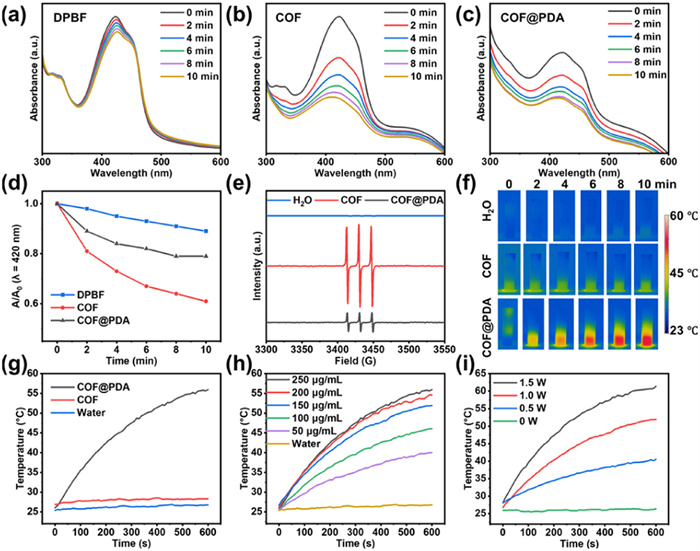 Figure 2.  UV–vis spectra of DPBF solutions containing (a) DPBF only, (b) COF (50 µg/mL) and (c) COF@PDA (50 µg/mL) when exposure to 660 nm irradiation (0.5 W/cm2) for different durations (0, 2, 4, 6, 8, and 10 min). (d) Comparison of the decay rate of DPBF induced by different samples. (e) Electron spin resonance spectra of different samples with TEMP. (f) Thermal images and (g) temperature variation curves of water, COF (250 µg/mL) and COF@PDA (250 µg/mL) under 808 nm laser (1.0 W/cm2, 10 min). Temperature variation curves of COF@PDA with (h) different concentrations and (i) different power density.
