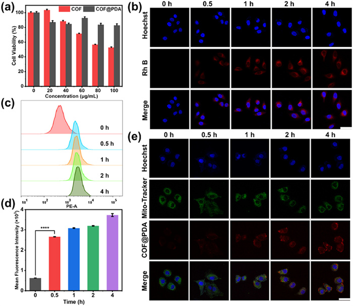 Figure 3.  (a) Viabilities of MCF-7 cultured with COF or COF@PDA in different concentrations. (b) CLSM images of MCF-7 cells incubated with Rh B labelled COF@PDA (50 µg/mL) for 0, 0.5, 1, 2 and 4 h. (c) Histogram analysis and (d) Mean fluorescence intensity values of flow cytometry for MCF-7 cells incubated with Rh B labelled COF@PDA. (e) CLSM images of MCF-7 cells coincubated with COF@PDA and MitoTracker Green. Data are presented as mean ± SD (n = 3). Scale bar: 50 µm. ****P < 0.0001.