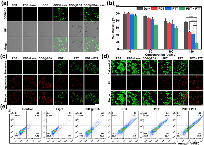 In addition, to evaluate irradiation-induced intracellular ROS production ability of COF or COF@PDA, a specific green fluorescent probe for 1O2 within cells was introduced using 2,7-dichlorodihydrofluorescein diacetate (DCFH-DA) fluorescence probe. As shown in Fig. 4a, the control groups that without laser irradiation had hardly any fluorescence, however, after incubation with COF or COF@PDA (50 µg/mL) for 4 h and then irradiation with a 660 nm laser (0.5 W/cm2) for 10 min, a remarkable DCFH-derived fluorescence was recorded within MCF-7 cells by a CLSM, indicating an excellent intracellular photo-induced ROS generation ability. After that, the efficacy of monotherapy or combined therapy of COF@PDA was evaluated using MCF-7 cells via CCK-8 assay, JC-1 kit and calcein acetoxymethyl ester and propidium iodide (calcein-AM/PI) double staining analysis for assessing cell proliferation and cytotoxicity. As shown in Fig. 4b, the results showed that the cell survival rate remained as high as 76.75% ± 1.17% in the dark with a dosage of 150 µg/mL, in the meanwhile, neither 660 nm nor 808 nm irradiation would cause any damage for cell viability. In contrast, the PDT monotherapy (660 nm laser, 0.5 W/cm2, 10 min) and PTT monotherapy (808 nm laser, 1.0 W/cm2, 10 min) gave cell viabilities of 48.30% ± 1.96% and 43.56% ± 7.19%, respectively. However, the cell viability derived from the combined therapy sharply declined to 17.61% ± 0.47%, indicating the outstanding combined therapy effects of PDT/PTT.