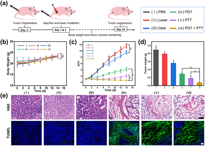 Figure 5.  (a) Schematic diagram of the animal experiment. (b) Body weight variation curves, (c) relative tumor volume changes and (d) tumor weight statistics of mice in different groups during 14-day treatment. (e) H&E and TUNEL-stained histological section of tumor slices. Data are presented as mean ± SD (n = 5). Scale bar: 100 µm. ns, no significance. **P < 0.01, ***P < 0.001.