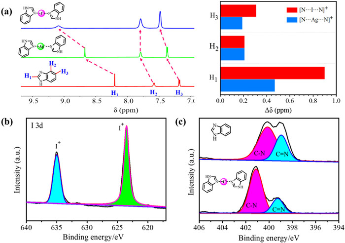 Figure 1  Partial 1H NMR spectra of BIa, and Ag+/I+ complex in DMSO–d6 (600 MHz, 298 K); inset: changes in the 1H NMR chemical shifts (Δδ = δobsd - δfree) for the H1—H3 protons of from monomers to complexes of Ag+ (blue) and I+ (red). (b) XPS spectrum of I 3d for BIa2IBF4. (c) XPS spectrum of N 1s for BIa2IBF4.