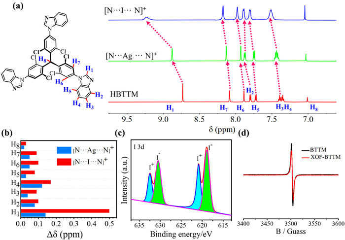 Figure 2  Partial 1H NMR spectra of HBTTM, and Ag+/I+ complex in DMSO–d6 (600 MHz, 298 K). (b) Changes in the 1H NMR chemical shifts (Δδ = δobsd - δfree) for the H1—H8 protons of from monomers to complexes of Ag+ (blue) and I+ (red). (c) XPS spectrum of I 3d for XOF-BTTM. (d) EPR spectra of BTTM and XOF-BTTM recorded in DCM solution at 298K.