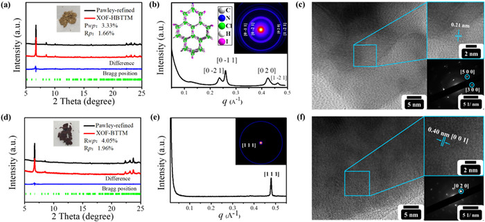 Figure 3  PXRD patterns of (a) XOF-HBTTM, (d) XOF-BTTM. SAXS pattern of (b) XOF-HBTTM, (e) XOF-BTTM. TEM, HRTEM (inset), and SAED (inset) images of (c) XOF-HBTTM and (f) XOF-BTTM.