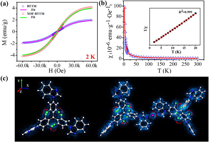 Figure 4.  (a) Field-dependent magnetization of XOF-BTTM measured at 2 K. The curves (blue circles) are experimental results, which is well consistent with the calculated results (red line) based on the Curie law. (b) Susceptibility of XOF-BTTM versus temperature (T) at an applied field of H = 3000 Oe. The curve of black circles are the experimental results, which is consistent with calculated results (red solid curve) obtained based on Curie law. (c) Magnetic induction comparison of BTTM and XOF-BTTM. Inset: for a magnetic field applied to the Z axis, the red arrow represents the direction of the induced current. Step length 0.85, number of particles 2500, max time to live 200.