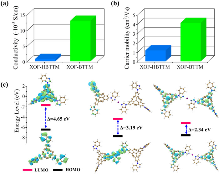 Figure 5  (a) Electrical conductivity of the XOF-HBTTM/BTTM. (b) Carrier mobility of the XOF-HBTTM/BTTM. (c) Ground-state frontier orbitals of the HBTTM, XOF-HBTTM, and XOF-BTTM.