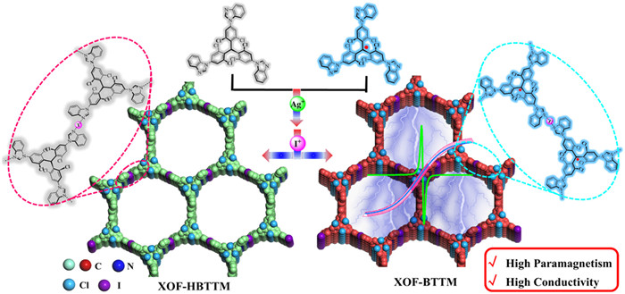 In this study, we describe the construction of a novel type of two-dimensional radical halogen-bonded organic frameworks. Benzimidazole-modified monomer (HBTTM/BTTM) was synthesized from tri(2,4,6-trichlorophenyl)methyl (TTM) and benzimidazole monomer (Scheme 1). The benzimidazole units were coordinated with Ag+ to form a precursor MOF, which was then converted into the target XOF through an in situ cation exchange process, replacing Ag+ with I+ to generate [N···I···N]+ halogen bonds. XOF-HBTTM and XOF-BTTM demonstrated good crystallinity, as evidenced by PXRD, HR-TEM, SEAD, and SAXS analyses. Importantly, EPR measurements confirmed the preservation of radical character within the XOF framework. SQUID measurements revealed that XOF-BTTM exhibits spin moments of S = 1/2 at 2 K, with a saturated magnetization strength peaking at 4.10 emu/g, compared to a saturation magnetization intensity of 1.87 emu/g for the monomer BTTM. DFT calculations suggest that the extended spin density distribution and the presence of [N···I···N]+ interactions within the XOF framework likely contribute to this enhanced magnetism. The conductivity of the radical XOF-BTTM reached up to 1.30 × 10−4 S/cm, a two-order-of-magnitude increase over that of non-radical counterpart, XOF-HBTTM. The carrier mobility of the radical XOF-BTTM was also improved. This enhancement is attributed to the reduced HOMO-LUMO gap, higher carrier density, and the presence of triphenylmethyl radicals within the framework. This work not only demonstrates the potential of benzimidazolyl motifs for constructing functional XOFs but also provides valuable insights into the structure-property relationships of radical-containing organic frameworks.
