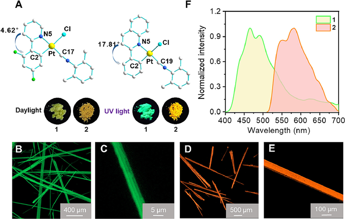 Needle-shaped crystals of 1 and 2 are successfully obtained by diffusion of diethyl ether into dichloromethane solutions. These crystals are subsequently analyzed using X-ray single crystal diffraction and confocal laser scanning microscopy (CLSM) (Figs. 1AE; Figs. S5, S6 and Table S3 in Supporting information). The molecules of 1 are arranged in a head-to-tail configuration, forming dimers through nonclassical intermolecular C—H…Cl interactions with a distance of 2.8 Å These dimers further associate into one-dimensional (1D) chains through intermolecular C—H…F interactions (2.6 Å) (Fig. S7 in Supporting information). The 1D chains then extend into a three-dimensional (3D) network by aligning head-to-head laterally. This arrangement is facilitated by π-π interactions between the 2-isocyano-1,3-dimethylbenzene auxiliary ligands, with a π[Ph]-π[Ph] distance of 3.4 Å, and between the 2-isocyano-1,3-dimethylbenzene and the isocyano triple bond, with a π[C-π[Ph] distance of 3.4 Å. Additionally, intermolecular C—H…π interactions (2.9 Å) and C—H…F interactions (2.4 Å) contribute to the overall 3D structure (Fig. S7). Molecule 2, characterized by a significantly larger π-conjugated ligand, exhibits a distorted planar structure. This is evident from the larger dihedral angle of 17.81° between the phenyl and quinoline groups, and an angle of 12.2° between the 2-phenylquinoline Pt(Ⅱ) center and the plane formed by the isocyanide and chloride ligands through Pt(Ⅱ) center. The molecules of 2 adopt a head-to-head fashion with the formation of 1D chains under π-π interactions between the phenylquinoline and isocyano triple bond (3.4 Å, π[C-π[Ph] distance), and intermolecular C—H…π interactions (3.0 Å) (Figs. S8 and S9 in Supporting information). Respective C—H…π hydrogen bonds between the 2-phenylquinoline ligands and 2-isocyano-1,3-dimethylbenzene auxiliary ligands connect the 1D chain into the 3D structure (Fig. S9 in Supporting information). The two crystals display different optical properties in response to external stimuli, particularly 2, which exhibits distinct optical behaviors under mechanical milling and hydrostatic pressure.