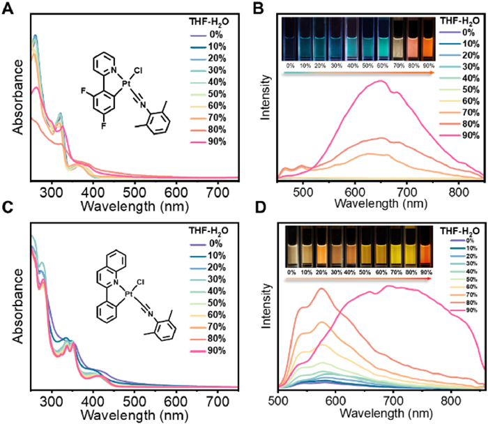 Figure 2.  Absorption spectral changes of 1 (A) and 2 (C) (1.0 × 10–4 mol/L) upon increasing the H2O content in THF at 298 K and emission spectral changes of 1 (B) and 2 (D) (1.0 × 10–4 mol/L) upon increasing the H2O content in THF at 298 K (λex = 365 nm) (Insets: corresponding emission photos under 365 nm UV irradiation).
