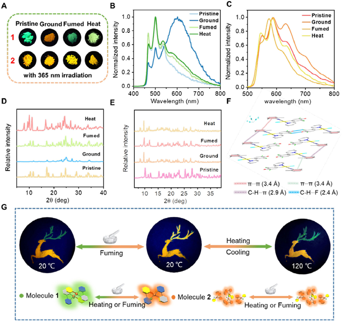Figure 3  (A) Photographs of 1 and 2 prepared from the pristine, ground, fumed and heat states under 365 nm UV light. Emission spectrum of 1 (B) and 2 (C) in different states. XRD spectrum of 1 (D) and 2 (E) in different states. (F) Crystal packing diagrams of 1 showing the presence of non-classical C—H…F, C—H…π hydrogen bonds and π-π interactions. (G) Emission patterns of 1 and 2 for patterning applications at 365 nm ultraviolet light.