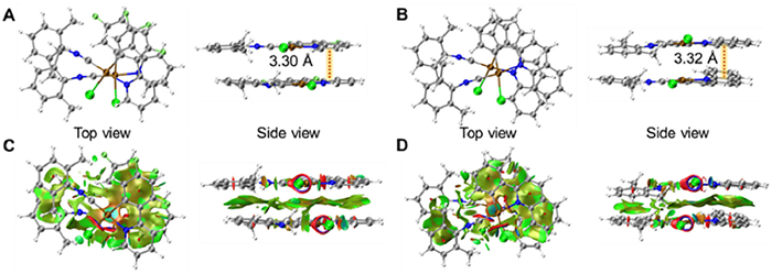 Figure 4  Optimized ground-state geometries of the dimers of (A) 1 and (B) 2. Isosurfaces of the noncovalent interaction for (C) 1 and (D) 2.