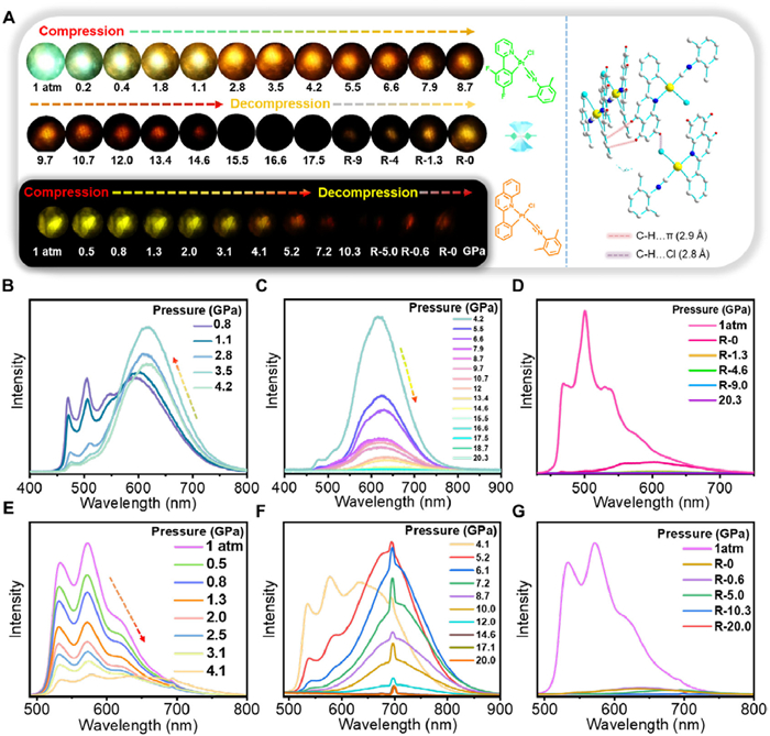 Figure 5.  (A) In situ emission micrographs of the powder form of 1 and 2 under different pressures (inset: crystal packing diagrams of 2 showing the non-classical hydrogen bonding interactions of C—H…Cl and C—H…π). (B–D) Emission spectra of 1 under different pressures. (E–G) Emission spectra of 2 under different pressures.