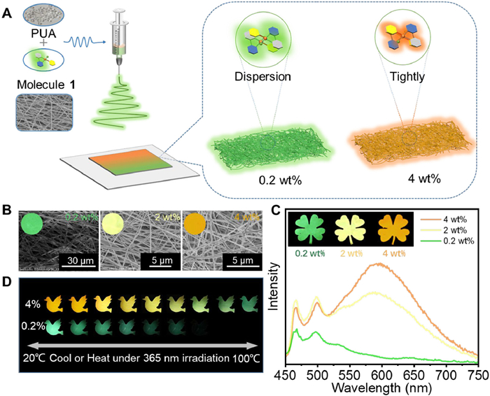 Figure 6  (A) Constructing electrospun fiber films with different emissions by adjusting the loadings of 1. (B) Scanning electron microscope (SEM) images of electrospun fiber films with different loadings of 1 (inset: corresponding photographs under 365 nm UV light). (C) Emission spectra of electrospun fiber films with different loadings of 1 (inset: leaf patterns of different emissions with different loadings of 1). (D) Emission patterns of electrospun fiber films with different loadings of 1 at different temperatures.
