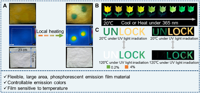Figure 7.  (A) Large-scale electrospun fiber film for temperature detection. (B) Emission patterns of electrospun fiber films with different loadings of 1 at different temperatures. (C) Constructing advanced information encryption materials based on electrospun fiber films responsive to temperature.