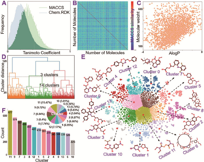 Figure 1.  The frequency distribution of Molecular fingerprint similarity. (A) Tanimoto coefficient and (B) MACCS fingerprint heat map analysis. (C) Distribution of chemical spatial diversity. (D) Hierarchical clustering of molecules in the ligand library was performed based on the Ward method. (E) Division and demonstration of compound clusters. Each color represents a kind of molecular cluster, and the center of the scatter plot corresponds to the central molecule of that cluster. (F) The proportional quantity of each cluster.