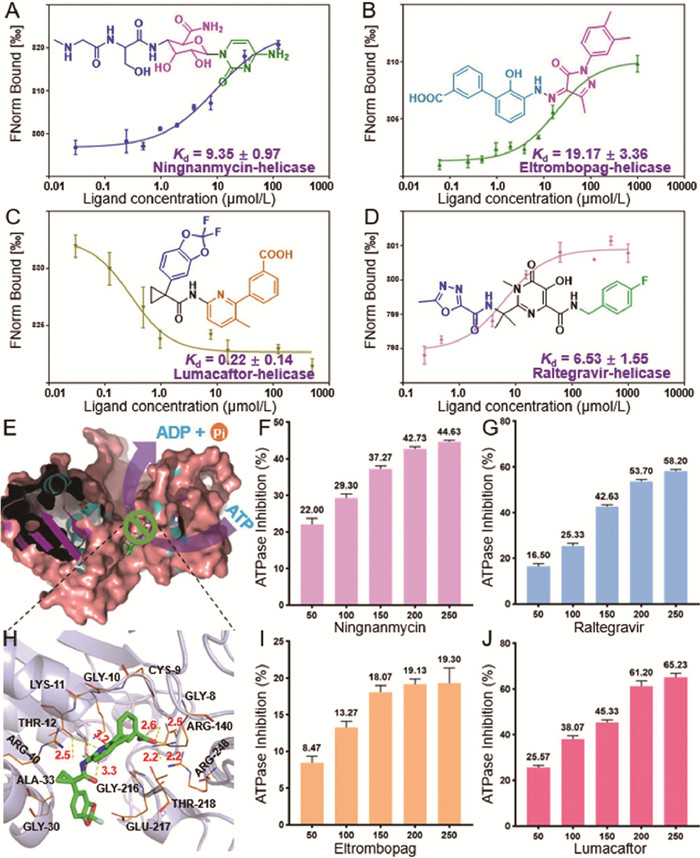 Figure 2  (A–D) MST measurement of hit molecules with TMV helicase. (E, H) Representative illustration of the interaction mechanism between lumacaftor and helicase. Different concentrations (50–250 µmol/L) of ningnanmycin (F), raltegravir (G), eltrombopag (I), and lumacaftor (J) anti-TMV helicase potency in vitro. Error bars indicate the mean ± standard deviation (SD) (n = 3).