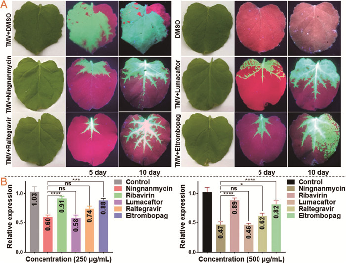Figure 3.  (A) Visualization and distribution of the TMV-GFP virus after 5–10 days of different drugs treatment. (B) The related transcript levels of viral helicase gene treated with ningnanmycin, ribavirin, raltegravir, eltrombopag, and lumacaftor at 250 or 500 µg/mL, respectively. Error bars indicate the mean ± SD (n = 3). ns, no significance. P < 0.05, ***P < 0.001, ****P < 0.0001.