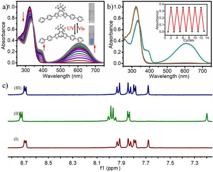 Figure 1  (a) UV–vis absorption spectra changes of OF-DAE-A1 upon continuous irradiation with 254 nm light for up to 6.5 min in the solution of CH2Cl2 ([OF-DAE-A1] = 1.0 × 10–5 mol/L). Inset: changes of the chemical structure and images under daylight of DAE-A1 upon alternating 254 nm and >600 nm light irradiation. (b) UV–vis absorption spectra and intensity changes (inset) at 610 nm for DAE-A1 upon alternating ultraviolet and visible light irradiation. (c) 1H NMR spectral changes observed for OF-DAE-A1 (Ⅰ, 1.0 mmol/L) upon irradiation with 254 nm (Ⅱ) and subsequent irradiation with >600 nm (Ⅲ) in DMSO-d6 at 298 K.