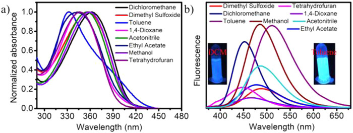 Figure 2.  (a) UV–vis absorption spectra. (b) Fluorescence emission spectra, and inset: photographs under 365 nm, of OF-DAE-A1-H in different solvents ([OF-DAE-A1-H] = 1.0 × 10–5 mol/L, λex = 350 nm).
