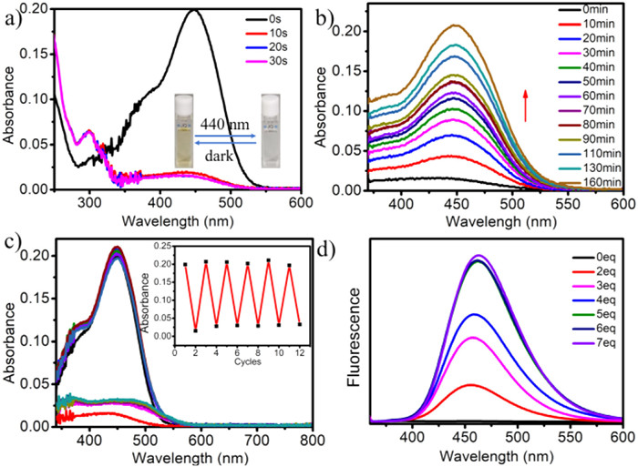 Figure 3  (a) UV–vis absorption spectra changes of MEH-D upon continuous irradiation with 440 nm light for up to 30 s in the solution of CH2Cl2 ([MEH-D] = 1.0 × 10–5 mol/L), inset: changes of the photographic images upon 440 nm light irradiation. (b) UV–vis absorption spectra changes of SP-D in dark for up to 160 min in the solution of CH2Cl2 ([SP-D] = 1.0 × 10–5 mol/L). (c) UV–vis absorption spectra and intensity changes (inset) at 450 nm for MEH-D upon alternating light irradiation and dark environment. (d) Fluorescence spectra of OF-DAE-A1 with different equivalents MEH-D after 10 s 440 nm light irradition ([OF-DAE-A1] = 1.0 × 10–5 mol/L, λex = 350 nm).