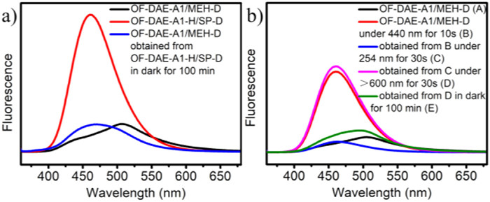 Next, we further investigated the photo-responsive properties of DAE-A1/MEH-D by fluorescence spectroscopy. Initially, DAE-A1/MEH-D exhibited a weak fluorescence emission peak at 510 nm. A significant increase was observed with a 50 nm hypochromatic shift to 460 nm upon 10 s irradition at 440 nm, which was derived from the generation of OF-DAE-A1-H and the system changed to OF-DAE-A1-H/SP-D in DCM (Fig. 4a). After the irradiation, fluorescence color changed from yellow-green to blue. After that, the reversed luminescence transformation experiment was also carried out. After removing the external 440 nm light for 100 min, the emission peak at 510 nm not only returned to the initial state but also had a slight blue shift to 470 nm. Interestingly, the luminescent properties of OF-DAE-A1-H/SP-D that obtained from OF-DAE-A1/MEH-D, could be controlled by 254 nm ultraviolet light and >600 nm visible light. As shown in Fig. 4b, when OF-DAE-A1-H/SP-D (Fig. 4b, curve B) was irradiated at 254 nm for 30 s, the intensity of the fluorescence emission at 460 nm decreased and the fluorescence quenching efficiency was calculated to be 87% on the basis of this experiment, with the system changed to CF-DAE-A1-H/SP-D (Fig. 4b, curve C). When CF-DAE-A1-H/SP-D was subsequently irradiated with visible light, the fluorescence of the solution returned to its original level and the system converted to OF-DAE-A1-H/SP-D (Fig. 4b, curve D). After putting OF-DAE-A1-H/SP-D in the dark environment for 100 min, it switched to OF-DAE-A1/MEH-D with the decrease of fluorescence (Fig. 4b, curve E).