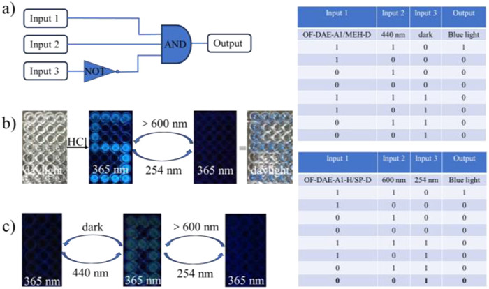 Figure 5.  (a) Scheme representation for the two INHIBIT logic gates and the corresponding truth tables. (b, c) Encryption information constructed by OF-DAE-A1 and OF-DAE-A1/MEH-D under daylight or 365 nm ultraviolet lamp.