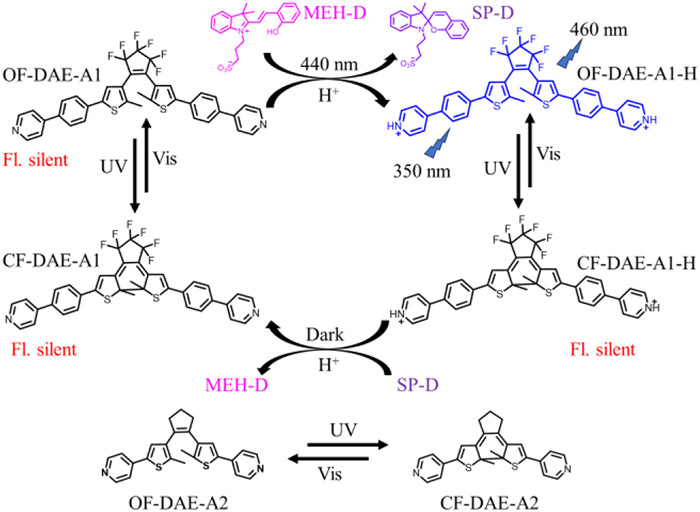 In conclusion, we successfully constructed an efficient multi-stimuli responsive luminescent system based on DAE-A1 and MEH-D. In this system, MEH-D acted as protons donor when exposed to 440 nm light and DAE-A1 acted as protons acceptor to form intramolecular charge transfer product DAE-A1-H. The formed DAE-A1-H could emit bright blue light under 365 nm ultraviolet lamp. On account of the reversible photoisomerization property of the MEH-D unit, the luminescence of DAE-A1 could be reversibly switched on/off under the stimulation of 440 nm/dark. In addition, the DAE-A1/MEH-D could also switch on/off the luminescence by alternating ultraviolet and visible light irradiation. Finally, the system was successfully utilized in logic gates and information encryption.