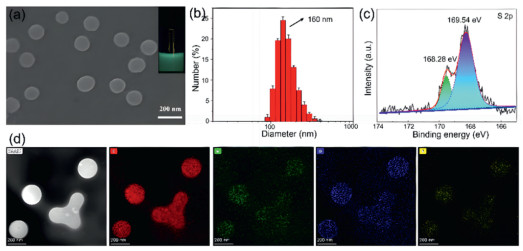 Figure 1.  (a) SEM and photo picture (inset) of PSTPE-FA nanoparticles. (b-d) DLS, binding energy and TEM-EDS studies of PSTPE-FA nanoparticles, respectively.