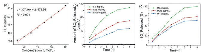 Figure 2.  (a) Standard curve for SO2 release. (b) The release of SO2 from PSTPE-FA NPs at various concentrations in response to GSH stimulation. (c) SO2 release rate of PSTPE-FA NPs under different GSH stimulus responses.